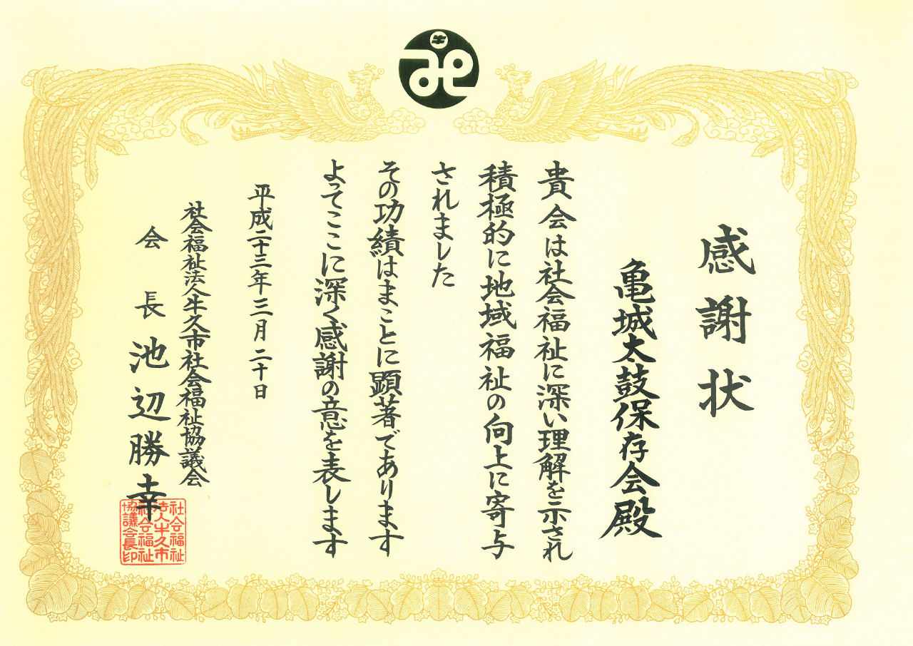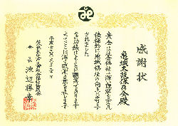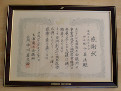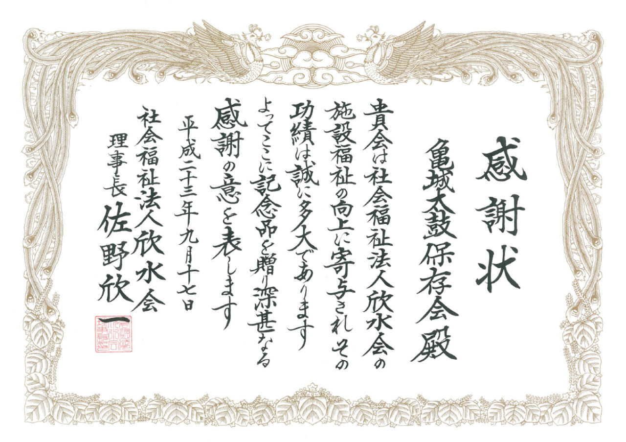 | 社会福祉法人欣水会の滝の園さんより 感謝状を頂きました。 | ||||
